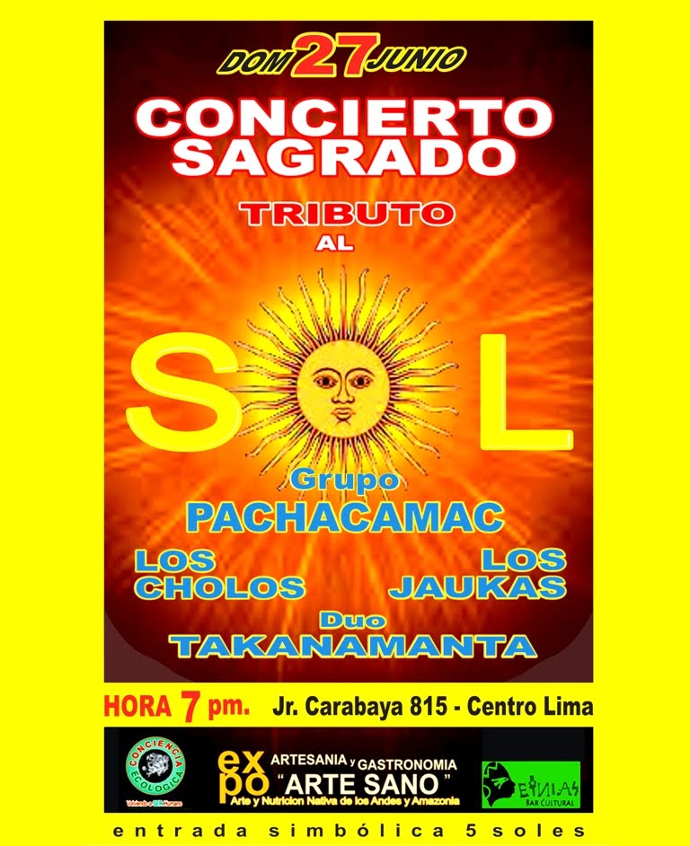 Este Domingo 27 a partir de las 7 pm. en el local ETNIAS de Jr. Carabaya 815, se desarrollará el CONCIERTO AL SOL, organizado por el grupo Conciencia Ecológica, donde participarán excelentes exponentes de la música popular peruana y latinoamericana, como el trío Los Cholos, el dúo Takanamanta, el grupo Los Jaukas, y el grupo Pachacamac.