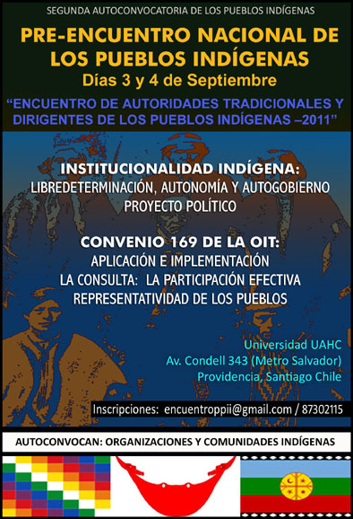 Los pueblos indígenas se autoconvocarán este 3 y 4 de septiembre en la Universidad UAHC en Santiago para proponer, discutir y decidir sobre temas trascendentales como: La Aplicación del Convenio 169 en Chile, La Consulta y participación según el Convenio 169 y estándares internacionales, Libredeterminación, Autonomía y Autogobierno.